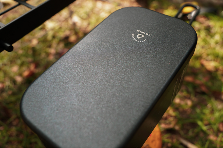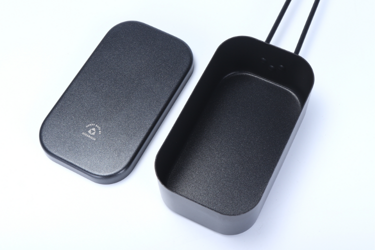 メスティンとしては珍しいおしゃれなブラック。艶のあるブラックではなく、セミマットな質感にしたので、高級感、雰囲気のあるカッコよさを出しました。蓋の上部にあるさりげないロゴもアクセントになります。