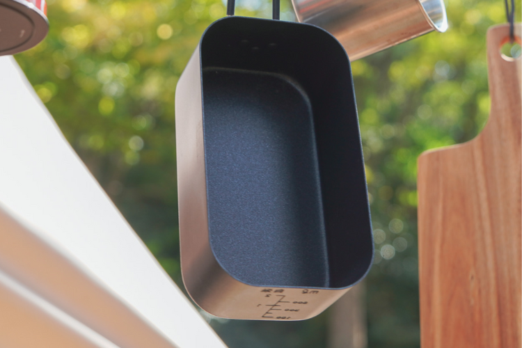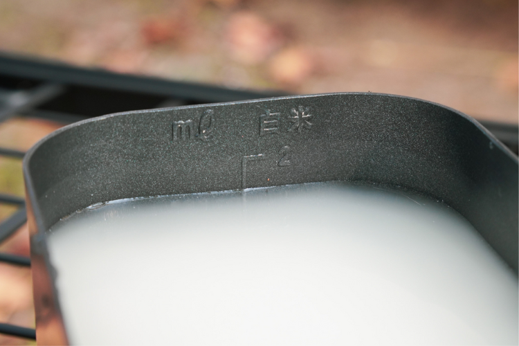 メモリ付きなので、量を測る手間が省けます。調理の際の計量カップとしても使用でき、水は最大800ml入り、目盛は100ml、300ml、500ml(2合のメモリで約600ml)まで付いています。さらに2合までのメモリの表示があり、飯盒としても使いやすくとても便利です。かさばる計量カップ不要で、荷物を少なくすることができます