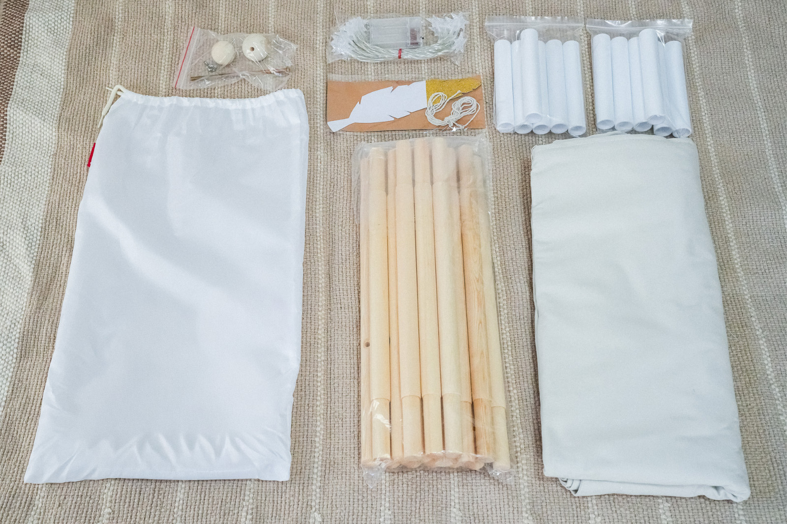 テント布✕1ウッドポール上下✕各4ずつ、ウッドポール中✕6連結パイプ✕12、LED星形ライトフェザー✕1